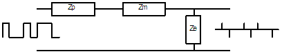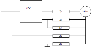 If we look at the circuit between the output of the VFD and the motor, we have a phase impedance Zp and an earth return impedance Ze. In series with this we have the impedance of the motor capacitance Zm and this is very low at high frequencies.